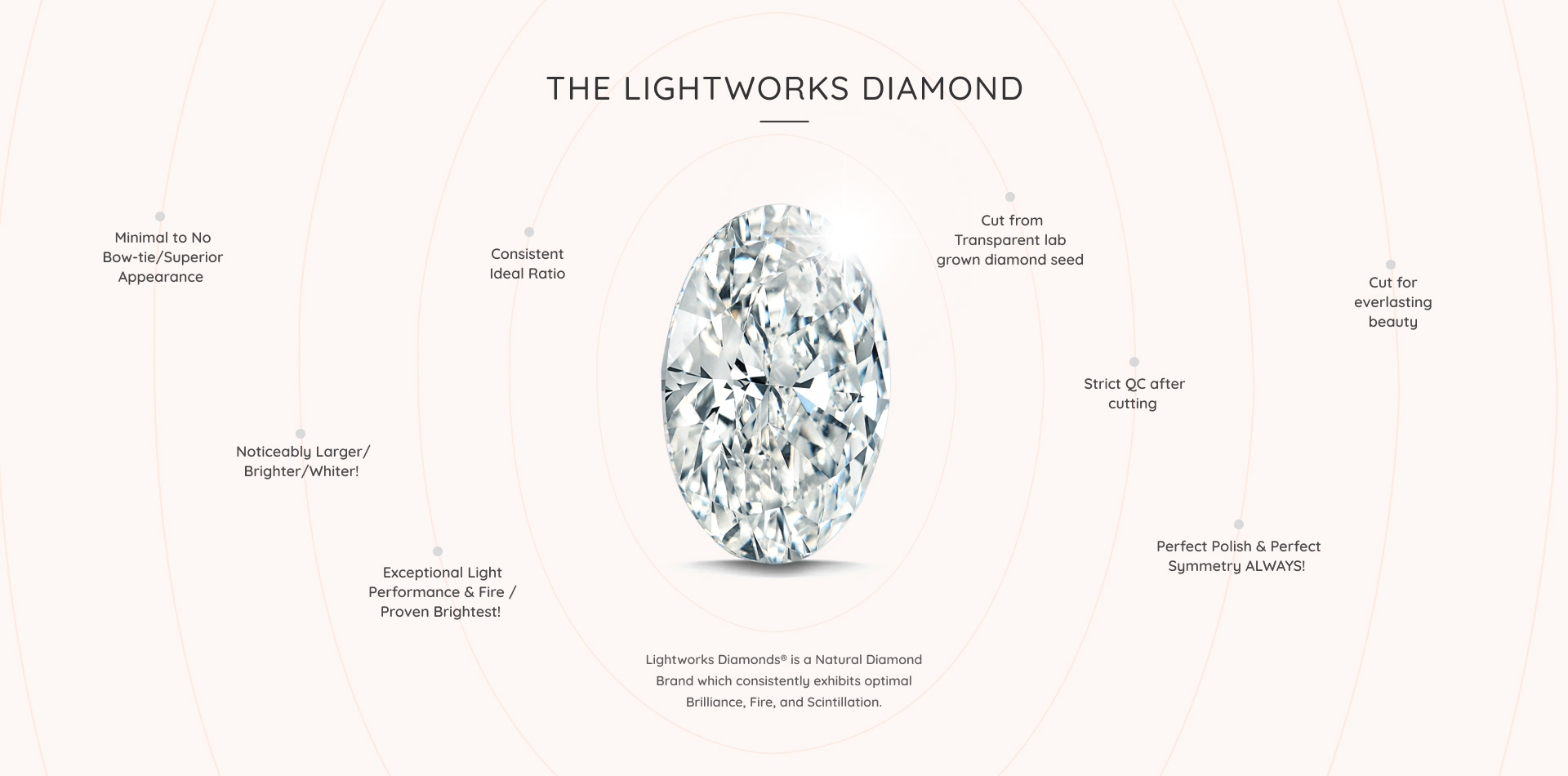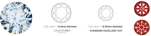 The precise and consistent proportions of every Lightworks Diamond™ result in it’s dimensions to be larger diameter on average when compared to other diamonds of the same carat weight. While two diamonds may share the same carat, Lightworks Diamonds™ consistently appear larger and more impressive, delivering exceptional visual presence.